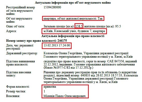 Звідки гроші на все це майно – невідомо, адже ніяких успішних бізнесіи, про які було би щось відомо, ніхто з членів родини не мав. Можливо, такі великі статки приносили посади очільника ДАІ та ГУ МВС України у м. Києві батьку Павла Олександровича, а нині - й посада прокурора самому Павлу Міленіну. Усі зібрані факти будуть передані до відповідних правоохоронних органів, які перевірять відповідність способу життя Міленіна Павла Олександровича його доходам.