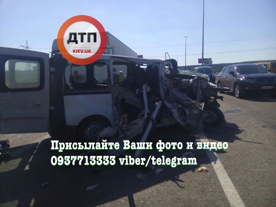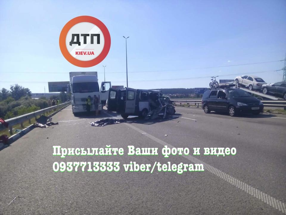 "Масштабное смертельное ДТП под Киевом. Житомирская трасса, 19 км до Киева. Полиция остановила фуру из-за жары, чтобы та не въехала в город. В это время в стоящую фуру на полном ходу влетел микроавтобус "Рено". В нем находилось около шести человек, один погиб на месте, второй - в карете скорой помощи, водитель не пострадал", - сказано в сообщении.