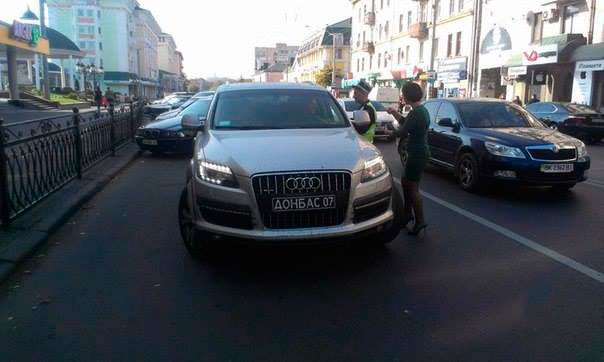 Пока 98 бойцов "Донбасса" испытывают пытки в плену, а волонтеры собирают по крохам на белье рядовым "донбассовцам", Семенченко гастролирует с политическим туром, раздает предвыборные обещания. На его новой дорогой "ауди" - блатной номер. Фото сделано в центре Ровно, где есть запрещающий знак. Но "полководцу" нарушать ПДД можно?