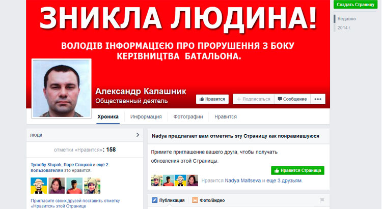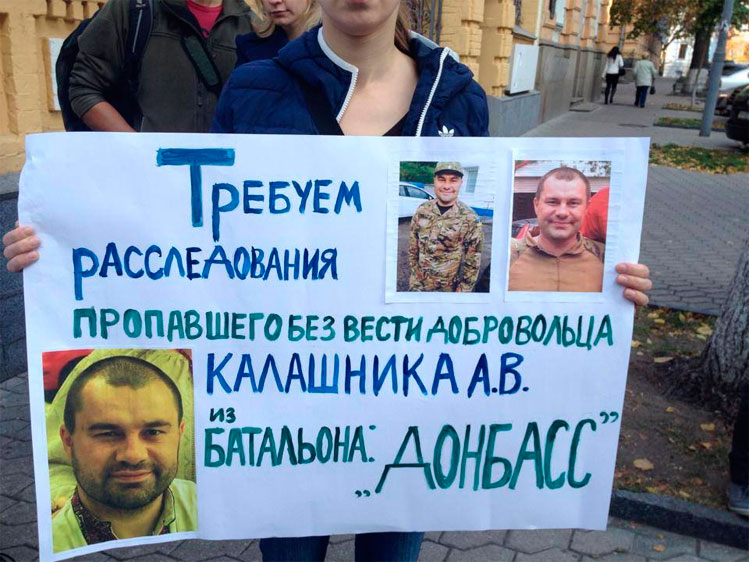 14 сентября около 15.00 из села Новые Петровцы Вышгородского района Киевской области (место дислокации батальона "Донбасс") в сторону автовокзала выехал на своей старенькой "Таврии" Александр Калашник. Кадровик-волонтер, зам. начальника штаба батальона "Донбасс" с позывным Калаш договорился встретиться с бойцом, ожидавшим его на центральном автовокзале Киева, через 40 минут. Столько требовалось на дорогу. Но уже в 16.00 телефон Калаша оказался выключен. Местонахождение неизвестно до сих пор.