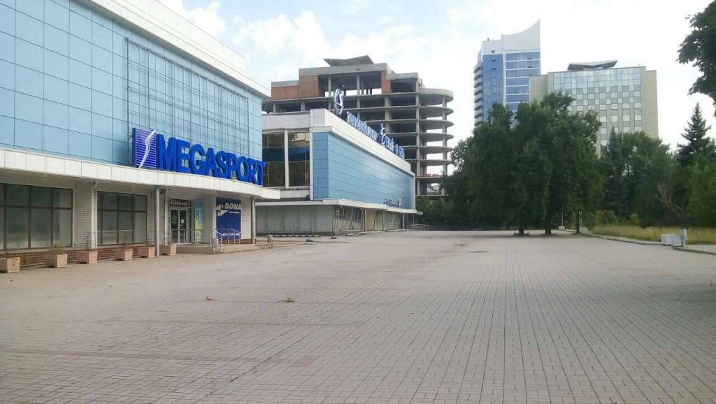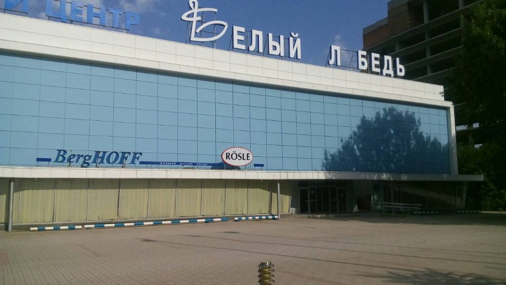 А это торговый центр «Белый лебедь». Главная улица города. Сколько я себя помню — тут кипела жизнь, работали дорогие бутики, место было очень оживленным. Теперь все умерло. Вокруг пустота. На стоянке ни одного автомобиля.