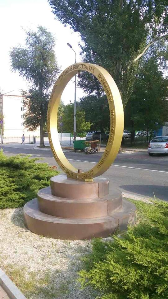 Раскуроченный назло фашистам памятник гривне. Когда его разломали, сначала думали, что вместо гривны вставят рубль. Но в итоге так ничего и не сделали. Теперь в центре города так и стоят обломки.