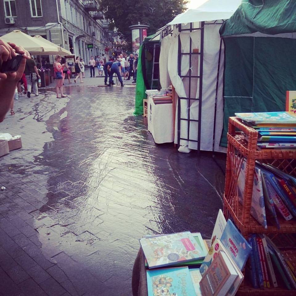 По ее словам, Дерибасовская заполнилась водой за считанные секунды, и не всем продавцам удалось спасти от воды коробки с книгами, лежащие на земле. Подойти к самим палаткам с книгами также было зачастую невозможно. Через некоторое время аварийная бригада откачала нечистоты с Дерибасовской.