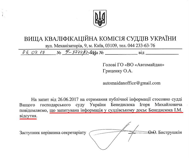На запрос в ВККС нам ответили, что такой информации (когда именно господин Бенедисюк получил гражданство Украины) в судейском досье нет.