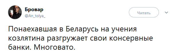 "Понаехавшая в Беларусь на учения козлятина разгружает свои консервные банки. Многовато". "Это не учения, это оккупация".