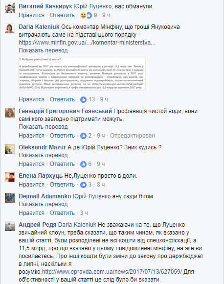 Сам Юрий Луценко комментирует ситуацию и утверждает, что это все неправда. И средства от спецконфискации пошли на армию и дороги. В тоже время, ему приводят ссылки на конкретные постановления правительства. Разгорается дискуссия.