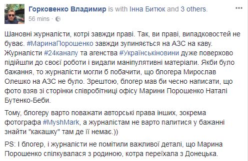Как написал Горковенко у себя в Facebook, блогера Олешко во время кофепития жены Порошенко в АЗС близко не было и ему следовало бы уважать авторские права других.