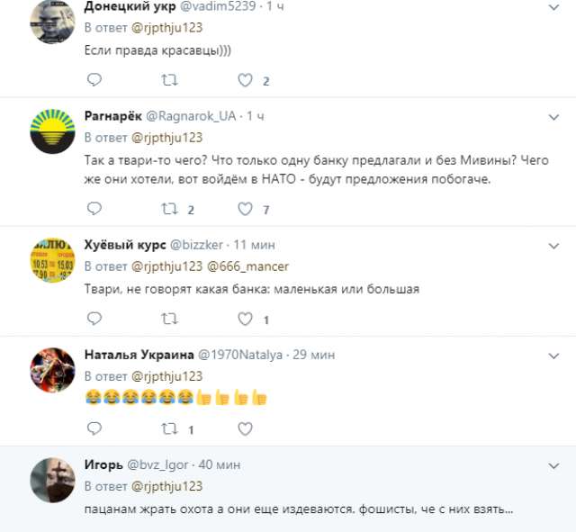 «Так, а твари-то чего? Что только одну банку предлагали и без Мивины? Чего же они хотели, вот войдем в НАТО — будут предложения побогаче».