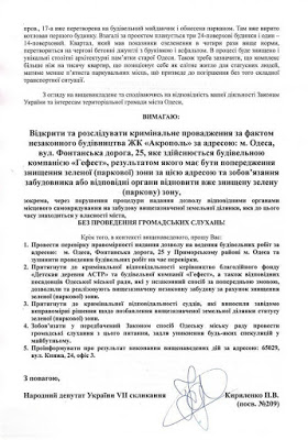 "Гефест" – компания, которая, начав строительство ЖК "", привела к уничтожению уникальной парковой зоны на 5 станции Фонтана. Жилой комплекс строится по ул. Фонтанская дорога, 25. Полностью проигнорировав законодательство Украины, так называемый благотворительный фонд "Астра" добивается вывода 4 гектаров парковой зоны общего пользования, определенных решением сессии Одесского городского совета от 2009 года, и передает их компании-застройщику, - заявил нардеп Кириленко.