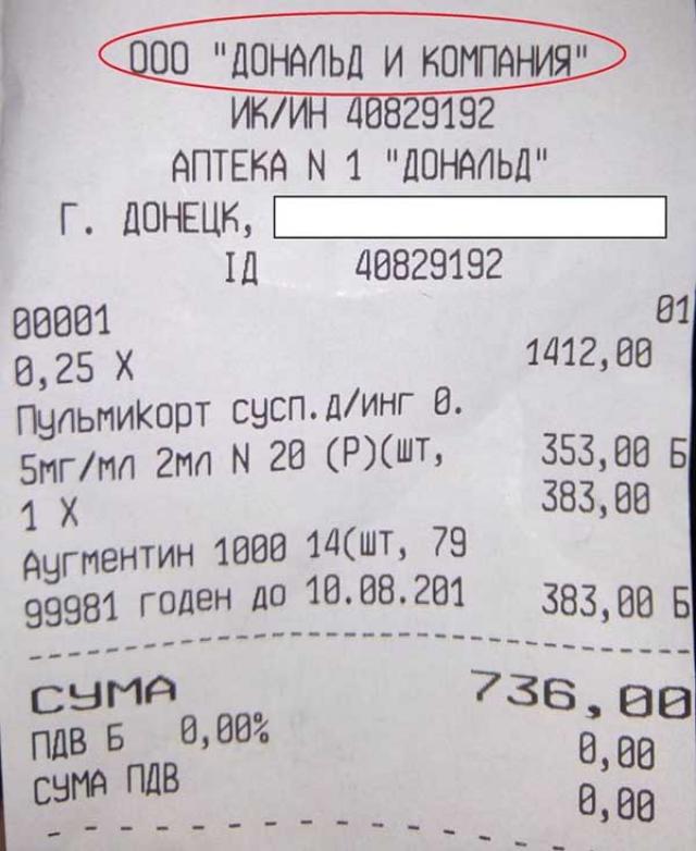 Жители оккупированного Донецка на своих страницах в соцсетях фото захваченного города. Так, в сети опубликована фотография товарного чека из аптеки под называнием «Дональд и компания».