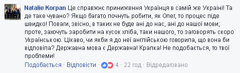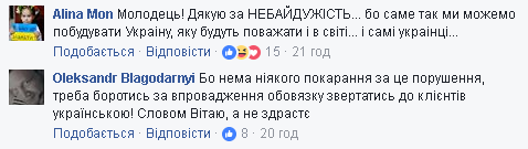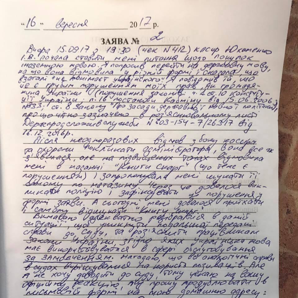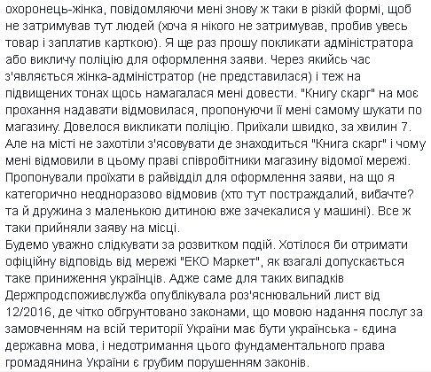 "Итак, "ЭКО Маркет" под Киевом (Вышгород, ул.Набережная, 2Б). Кассир Юхименко начинает задавать мне вопросы на иностранном языке, я прошу украинском, на что она резко отказывает. Я сообщаю, что она нарушает законы Украины, по которым обслуживание/предоставление информации по умолчанию должно происходить на украинском языке. Она нагло говорит, что "а я не понимаю укрÁинский. И вообще я русская". Я прошу позвать администратора и книгу жалоб. Администратор не приходит, за кассира пытается заступиться охранник-женщина, которая опять же в резкой форме заявила, чтобы я не задерживал здесь людей (хотя я никого не задерживал, пробил весь товар и заплатил карточкой)", - написал он.