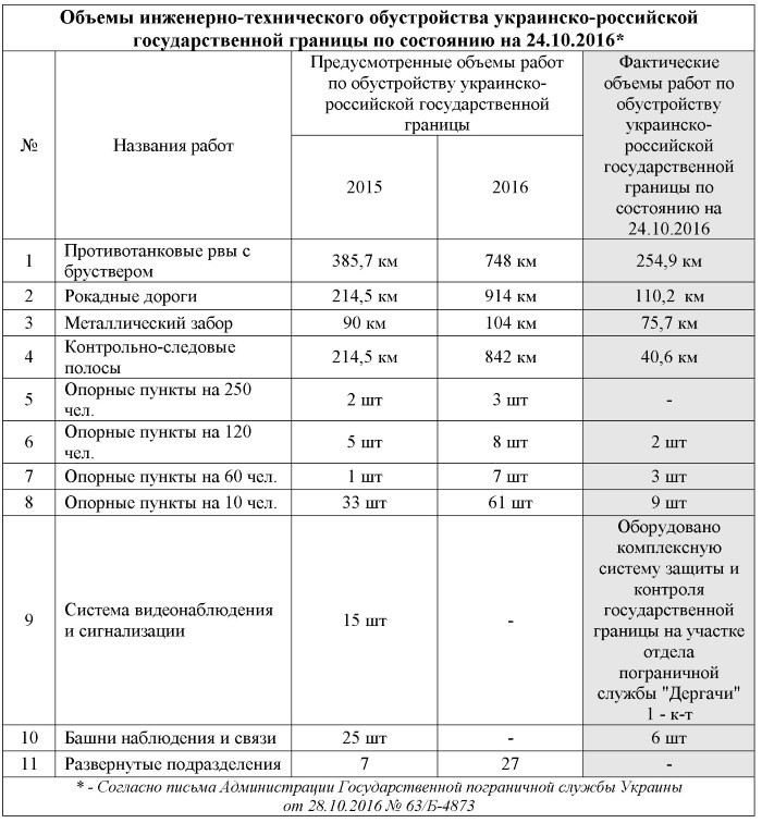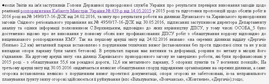 Руководству Госпогранслужбы было известно о приписках: департамент анализа и оценки информации подавал руководству службы отчеты о результатах выполнения проекта "Стена". Там прямо говорилось о невыполнении в полном объеме профинансированных работ по обустройству границы. Не были завершены 55,6 км рокадных дорог, 12,6 км металлического забора, 5 опорных пунктов, 7 огневых позиций. Ограда установлена некачественно с нарушением требований проектной документации; опоры забора не забетонированы; из-за неправильного планирования почвы ограждение снизу разрушается и т.п.: