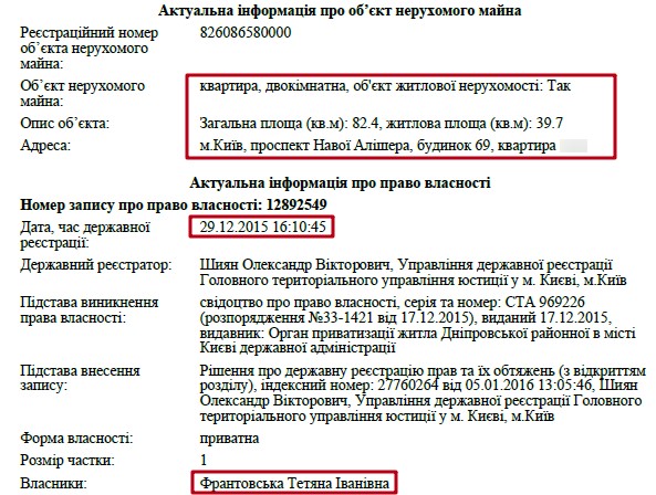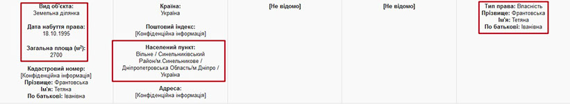 Якщо відкрити декларації судді, то побачимо, що майна у власності її родини небагато. Та з ідентифікацією місця розташування цього майна у нас виникли складнощі, адже воно здебільшого відсутнє у реєстрі прав на нерухоме майно. Сама Тетяна Іванівна Франтовська володіє будинком на 198 м² в м. Синельникове, що на Дніпропетровщині. Вказана в декларації вартість будинку – 60 тис. грн. У Синельникове суддя має і земельну ділянку площею 2700 м².