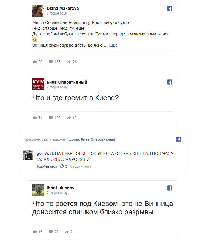 «Мы на Софиевской Борщаговке. У нас взрывы слышны. Иногда слабее, иногда громче. Очень знакомые взрывы. Не салют. Здесь мы вряд ли можем ошибаться. Винница сюда звук не даст, это ясно», — написала волонтер Диана Макарова.