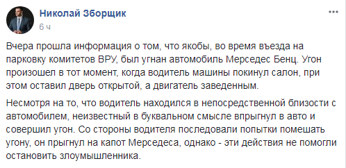 Глава охранного агентства "Антикиллер" Николай Зборщик написал в Facebook, что угон произошел в тот момент, когда водитель машины покинул салон, при этом оставил дверь открытой, а двигатель заведенным.