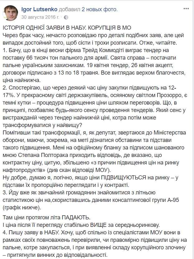 30 августа парламентарий написал, что обратил внимание на тендер по закупке 66 тыс. топлива для нужд армии. Он описал хронологию сделки: 19 апреля был проведен тендер, через неделю - акцепт, а в середине мая были подписаны соответствующие договоры. То есть, его рассказ полностью укладывается в канву фабулы дела от НАБУ.