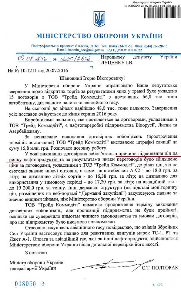 Он также привел свою переписку с МОУ, где в ответе за подписью министра Полторака нардепу сообщили - контрактная цена поставки топлива по договорам с "Трейд-Коммодити" образца весны-лета 2016 года выросла "по причинам увеличения цен на рынке нефтепродуктов".