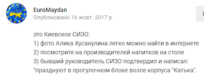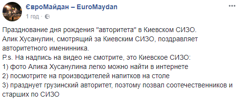 "На надпись на видео не смотрите, это Киевское СИЗО. Посмотрите на производителей напитков на столе. Празднует грузинский авторитет, поэтому позвал соотечественников и старших по СИЗО", - поясняется в тексте.