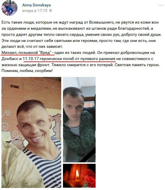 "Террорист Михаил Кошанский, позывной которого "Вред", хвастался ненавистью к Украине в Интернете недолго - 11 октября террорист умер от пулевого ранения, несовместимого с жизнью", - сказано в сообщении.