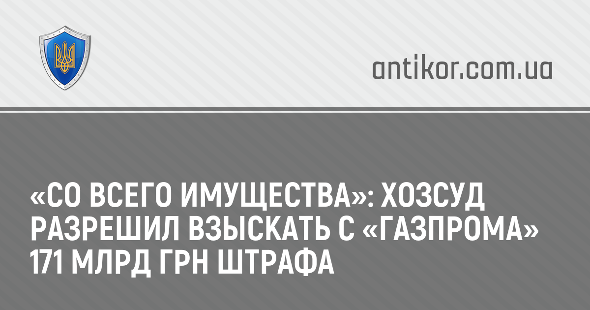 «Хозяйственный суд города Киева удовлетворил ходатайство Антимонопольного комитета Украины и исполнительной службы Минюста и изменил способ исполнения судебного решения относительно взыскания с «Газпрома» штрафа в 171 млрд грн. Проще говоря, если до сих пор можно было взыскать только средства «Газпрома», размещенные в банках, то теперь взыскание распространяется на все имущество должника», — написал Петренко.