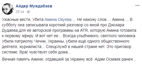 "В субботу она записывала короткий разговор со мной про Джохара Дудаева, для её авторской программы на ATR, которую Амина готовила к первому эфиру. И вот нет ее... Всегда улыбчивого, светлого человека. Убили патриотку Чечни, Украины, убили ещё одного общественного деятеля, журналиста..." - написал он.