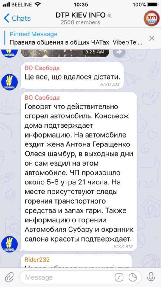 "Как оказалось, на том авто ездила молодая девушка, внешне очень похожая на мою жену. Вот почему поджигатели решили, что на этом авто ездила моя супруга и решили устроить эту провокацию с поджогом и попыткой обвинить в этом митингующих под Радой", - пояснил он.