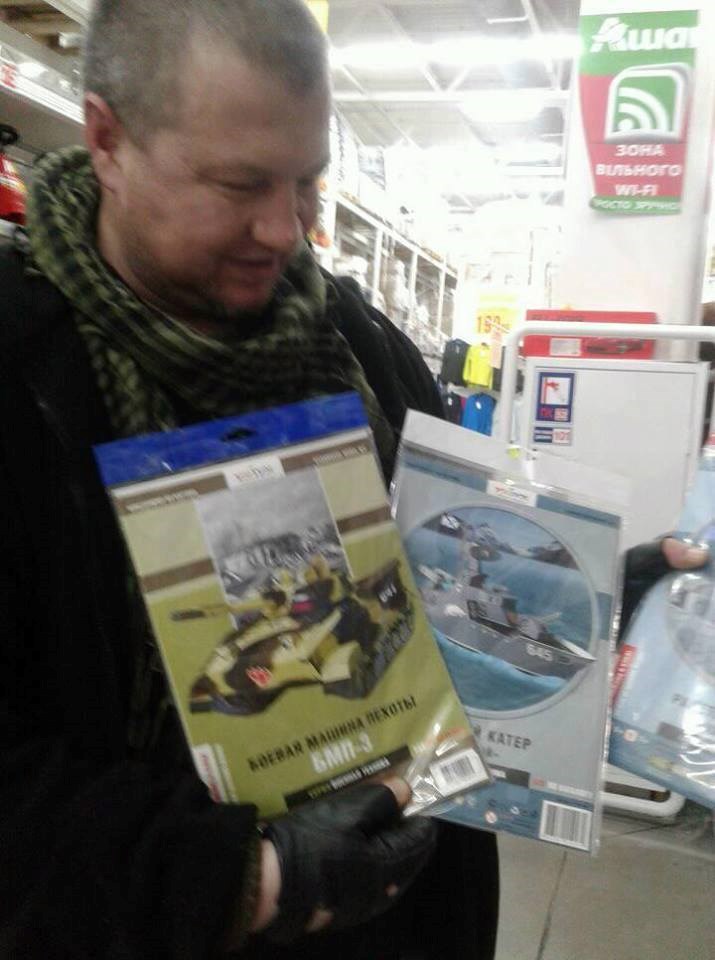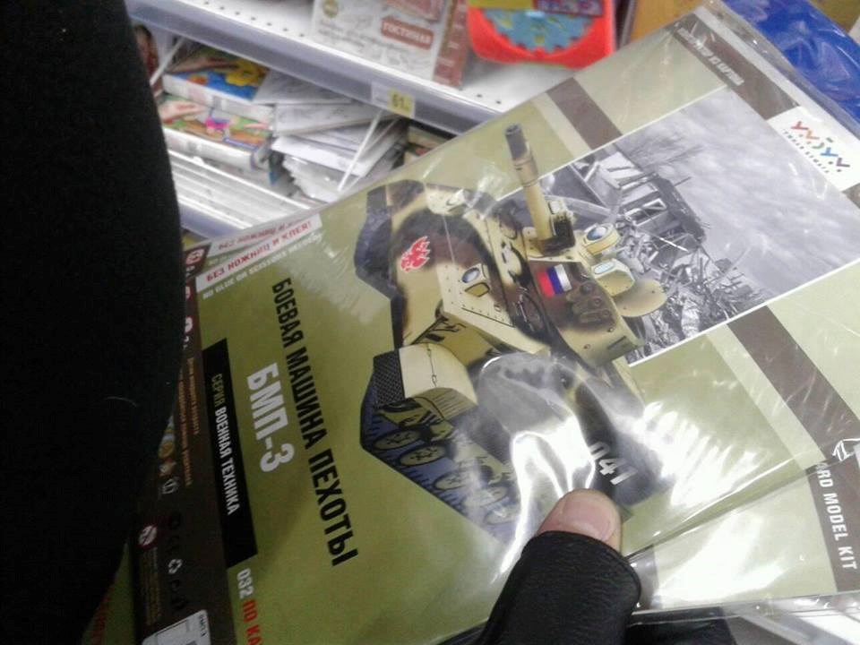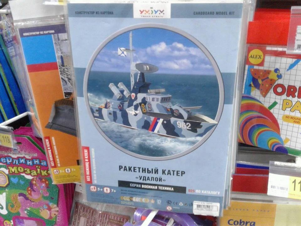 "Такое предлагается украинским детям в магазине Ашан, в Новобеличах..." - подписал он кадр, на котором запечатлены картонные российские БМП и ракетный катер.