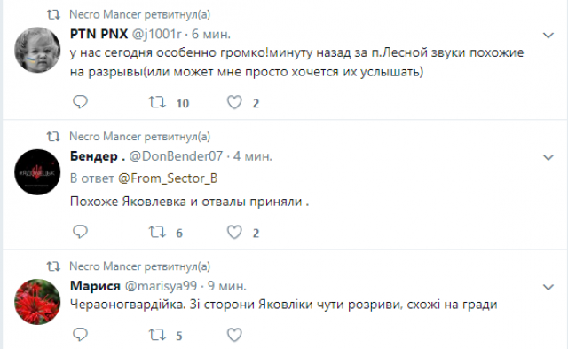 «17:39—17:43(местное), примерно на равном удалении залпы и (через 7−8 сек) падения, работала пара 120 мм минометов. То парные залпы, то одиночные, около 12 мин всего, +/-, откуда и по чем били трудно сказать, но взрывалось очень громко, объемно»;