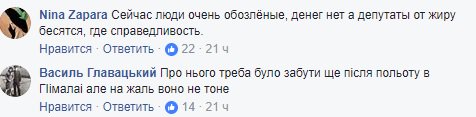 «Сейчас люди очень обозленные, денег нет. А депутаты от жира бесятся, где справедливость», «О нем надо было забыть еще после полета в Гималаи, но, к сожалению, оно не тонет», «Помнишь гнида, как орал на сцене Майдана, только наверное забыл что и кому», — писали в сети.