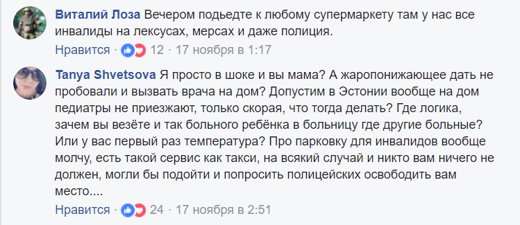 "Ситуация на парковке детской поликлиники!!! Я с больным ребенком приехала сегодня в поликлинику, на парковке свободного места для машины не было , кроме места для инвалидов, в то время как патруль стоял на на парковке!!! (для того что б выполнить свой план) Естественно я припарковала машину на месте для инвалидов (я думаю меня многие поймут) выхода у меня не было. После посещения врача выхожу, а нас уже ждут, для того чтобы выписать штраф. Ок! СпрашиваюЮ сколько нужно времени для составления протокола? Ответ: 4 мин. Прошло 20! Попросила представится! Ответ: это ваши проблемы! Все видно на видео!!! До чего мы докатились???" – написал в Facebook одесситка Наталья Коваль.