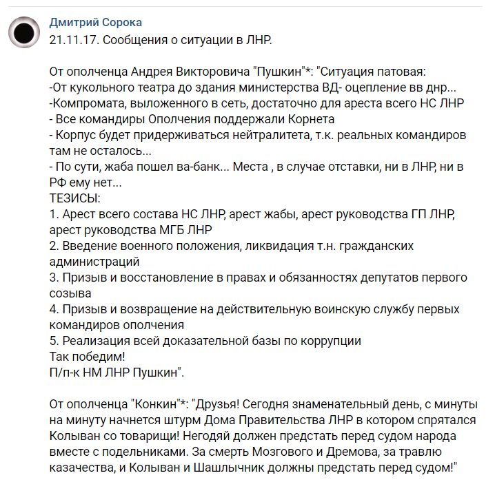 В то же время сепаратистские паблики в соцсетях сообщают, что здание Луганской ОГА оцеплено. Правда, пока неясно кем. Зато боевики Корнета взяли под контроль админсуд и хотят штурмовать “дом правительства ЛНР” чтобы свергнуть Плотницкого. Они заявляют, что многие командиры наемников поддержали сепаратистского "министра МВД", Поэтому Плотницкий решил действовать ва-банк.