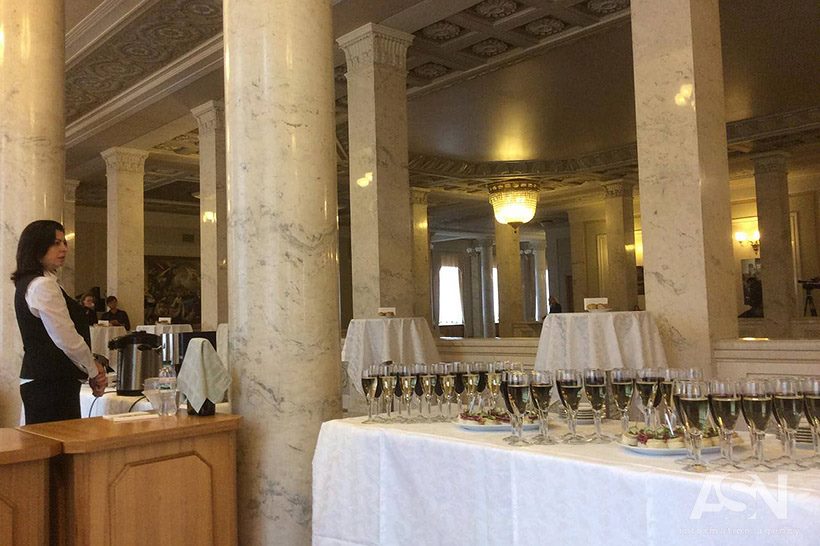 Прямо в кулуарах, где обычно регистрируются нардепы в пленарные недели, накрыли столы с белым и красным вином, закусками.
