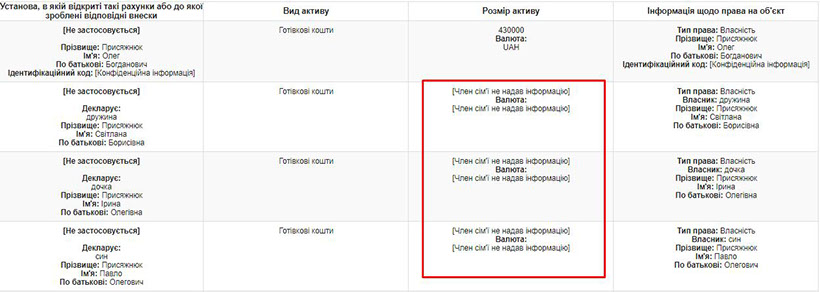 Декларація цікава ще тим, що у всіх членів сім’ї є готівкові кошти, але усі вони вже два роки поспіль начебто відмовляються надавати йому інформацію щодо їх суми і навіть валюти.