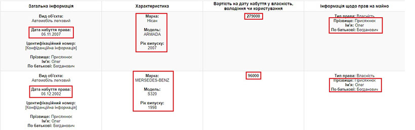Неправдивою також виявилася інформація щодо відсутності у судді Присяжнюка рухомого майна. Згідно з декларацією, у власності Олега Борисовича 2 автомобілі: Nissan Armada 2007 року випуску та Mercedes-Benz S320 2008-го.