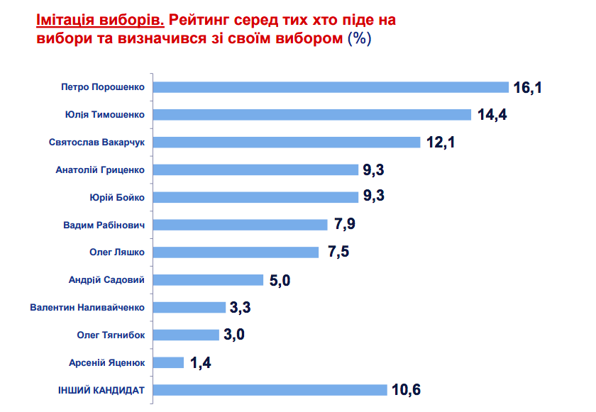 Также указывается на манипулятивность формирования анкеты. В нее включили, например, оппозиционера Наливайченко, который “занизил” результат Тимошенко, но почему-то не включили Гройсмана, который бы наверняка занизил результат Порошенко.