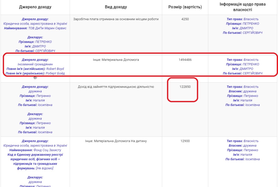 Интересно, что в прошлом году Дмитрий Петренко получил зарплату в 4,25 тыс. гривен в крюинговой компании D.P. Marine Service , а также материальную помощь от некоего иностранца Роберта Бойда – почти 1,5 млн гривен.