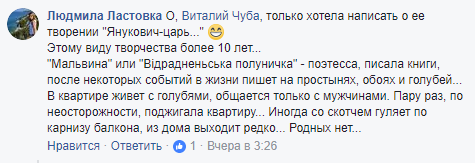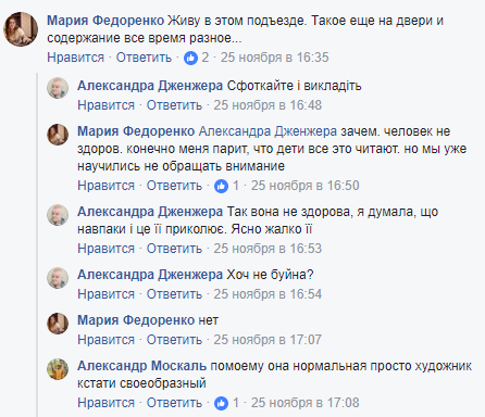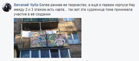 В комментариях к записи местные жители рассказали, что в квартире с необычным балконом живет художница, которая раньше иллюстрировала детские книги, а теперь рисует подобные плакаты и красит перья голубям. Также соседи художницы сообщили, что подобные произведения часто появляются и на двери ее квартиры, причем содержание их каждый раз разное.