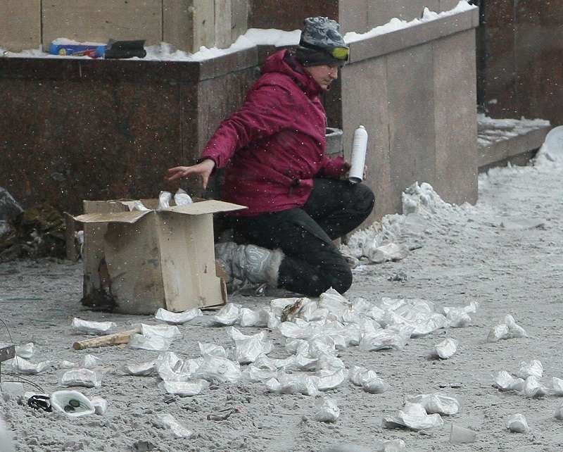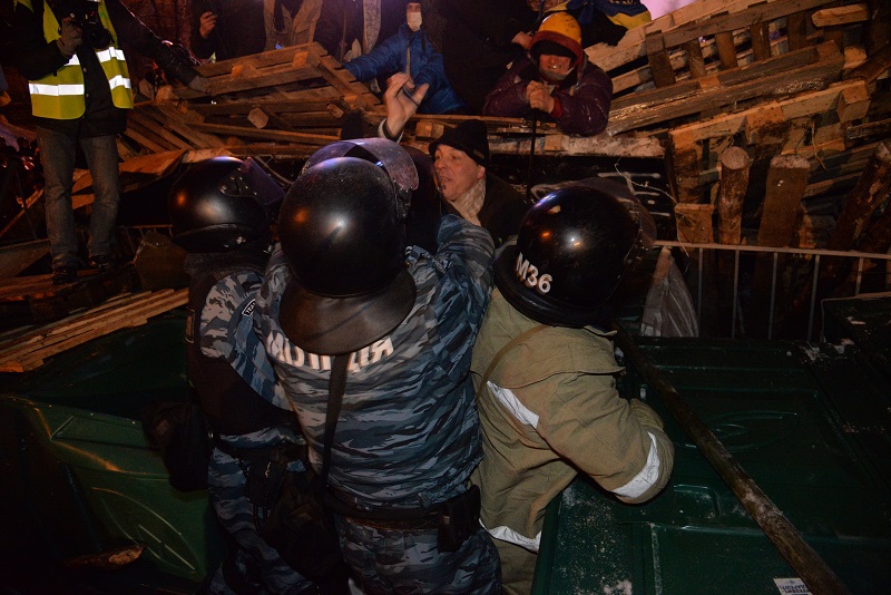 Кличко с громкоговорителем в руках бегает среди активистов, атакующих автобус «Беркута». Из толпы ему в лицо выпускают струю порошкового огнетушителя. «Крещенское побоище» стало переломным для Майдана и ознаменовало собой переход к радикальным действиям противоборствующих сторон. Утром в этот день на Майдане Незалежности состоялось восьмое по счету вече, которое прошло под лозунгами массовой мобилизации.