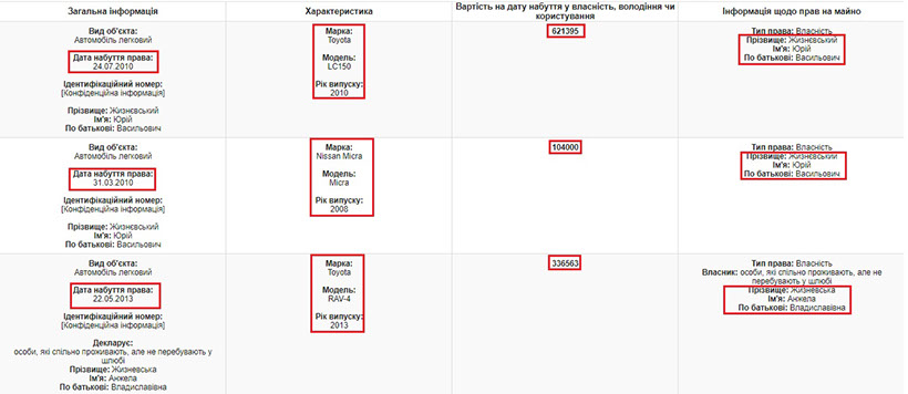 Крім нерухомості, у власності Юрія Жизнєвського 2 автомобілі: Toyota LC150 2010 року випуску та Nissan Micra 2008 р.в. Ще одним автомобілем, Toyota RAV-4 2013 р.в., володіє і дружина судді.