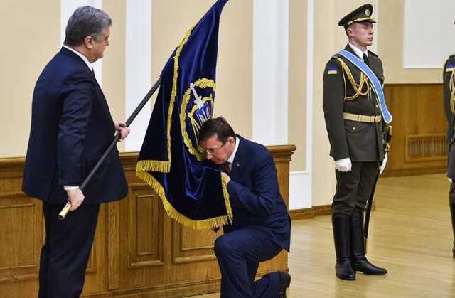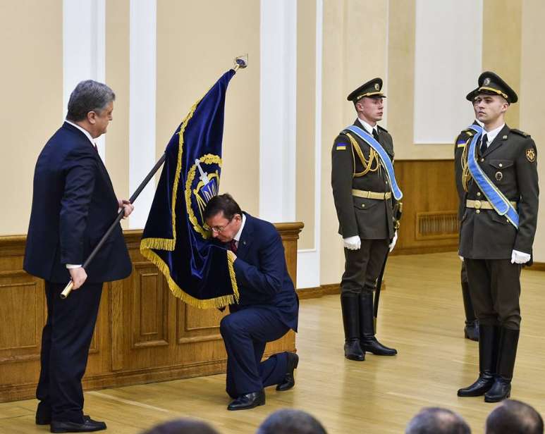 Луценко на коленях целовал знамя прокуратуры в руках Порошенко