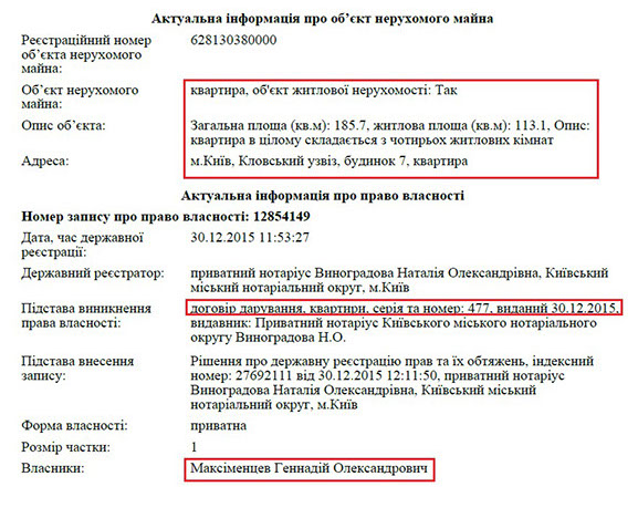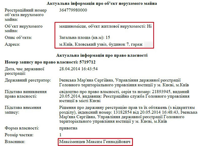 Окрім цього, у 2014 році Максим Геннадійович придбав гараж в елітному будинку в Києві за адресою Кловський узвіз, 7. От тільки квартири в цьому будинку Максіменцев Максим не має. Хоча відсутня вона лише в декларації. Натомість ми дізналися, що житлом на 185 м² у цьому будинку володіє 78-річний батько Максима – Геннадій Олександрович Максіменцев. Дану квартиру йому подарували у 2015 році.