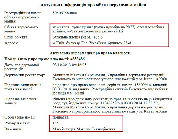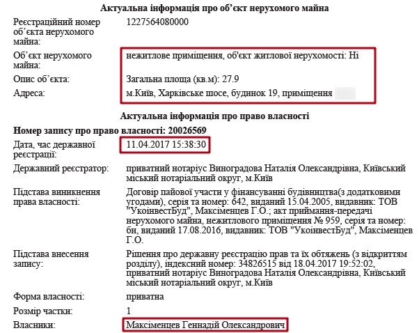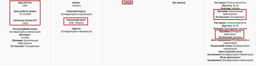 Не менше майна є і в чоловіка прокурорки. У його власності офіс за адресою бульвар Лесі Українки, 23-А (по сусідству із вище згаданою квартирою дружини). Цим приміщенням Максим Геннадійович володіє разом із Білецькою Нелею Іванівною.