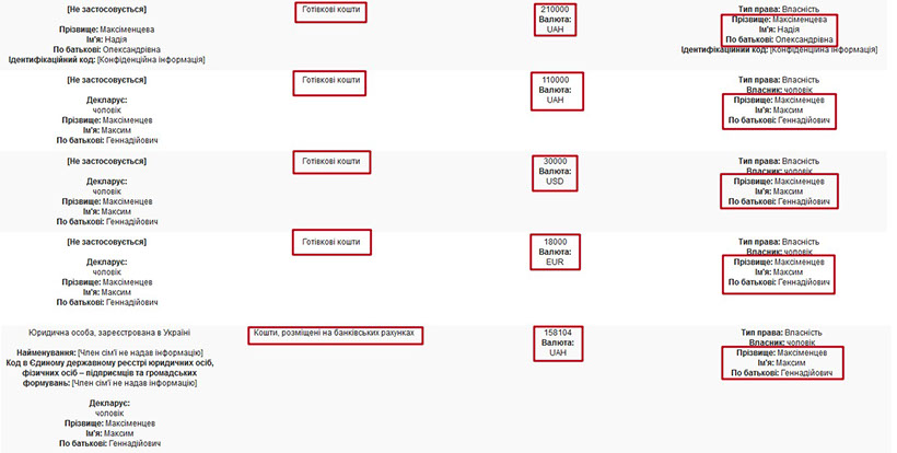 Також у подружжя доволі багато заощаджень. Готівкою у них 30 тис. доларів, 18 тис. євро та 320 тис. грн. Ще 158 тис. грн Максим Геннадійович тримає у банку.
