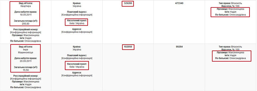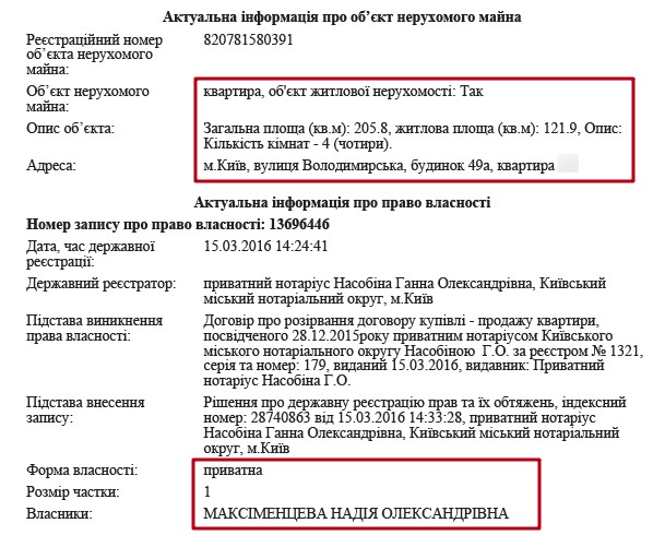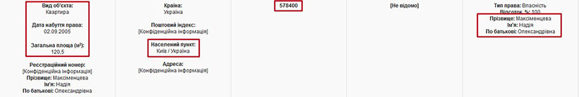 Також пані Надія задекларувала ще одну квартиру в Києві площею 120 м². Це житло відсутнє в державному реєстрі речових прав на нерухоме майно, а тому достовірної інформації про його розташування немає. Однак за нашими даними ця квартира може знаходитися за адресою бульвар Лесі Українки, 23.