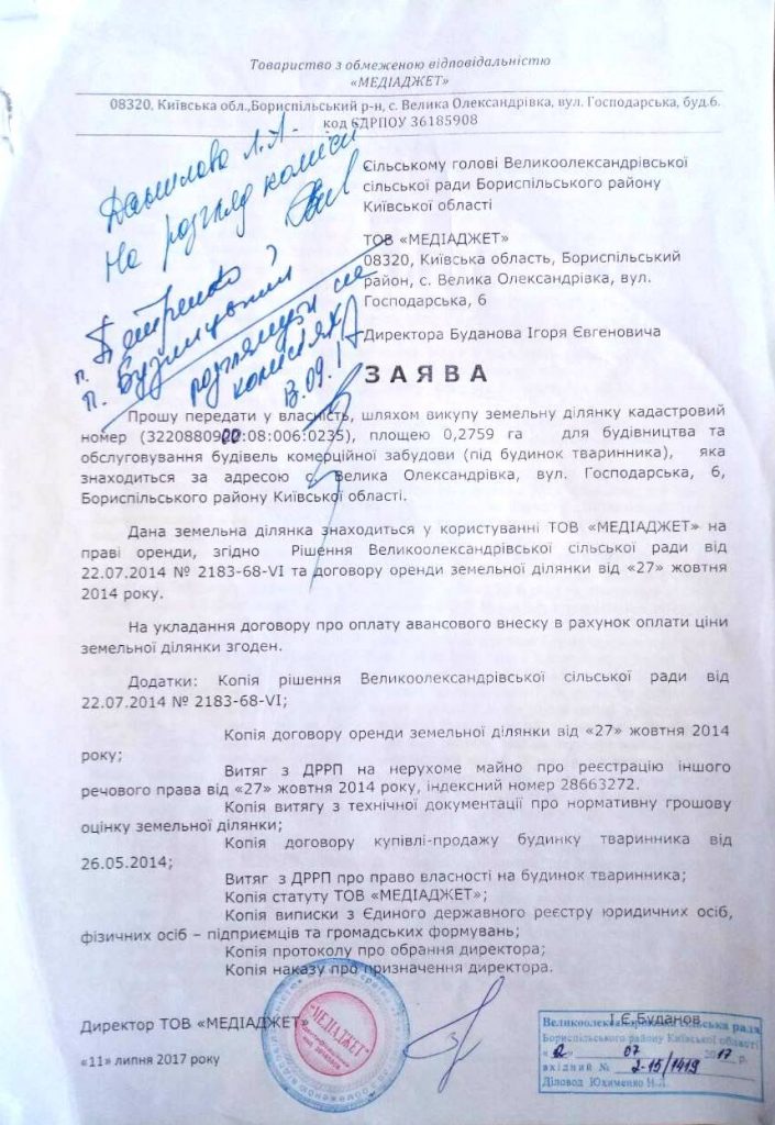 12.07.2017 тов «Медіаджет» подає заяву з проханням передати земельну ділянку з кадастровим номером 3220880900:08:006:0235 у власність ТОВ «Медіаджет».