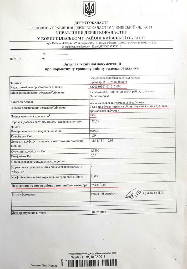 Згідно з документом, нормативна грошова оцінка земельної ділянки зменшилась більше ніж у 3 рази – до 759 210,24 грн.