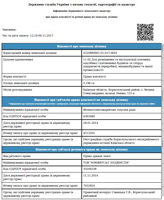 Згідно з інформацією з Державного земельного кадастру про право власності та речові права на земельну ділянку з кадастровим номером 3220880901:01:017:0001, ця земельна ділянка перебуває в оренді у ТОВ "ЮНІВЕРСАЛ ЛОДЖИСТІК".