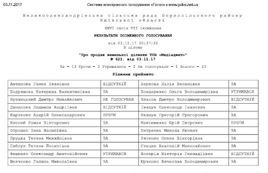 І вже у листопаді 2017 року депутати Великоолександрівської сільської ради на сесії голосують «ЗА» продаж земельної ділянки ТОВ «Медіаджет».