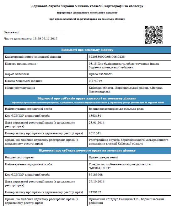 - Вказаний у документі орендар – ТОВ «Медіаджет», площа ділянки - та сама (2759 м2) але кадастровий номер ділянки – не співпадає з вказаним у договорі та заяві (3220880901:01:017:0001- у витягу та 3220880900:08:006:0235 – у договорі оренди та у заяві з проханням передати землю у власність).