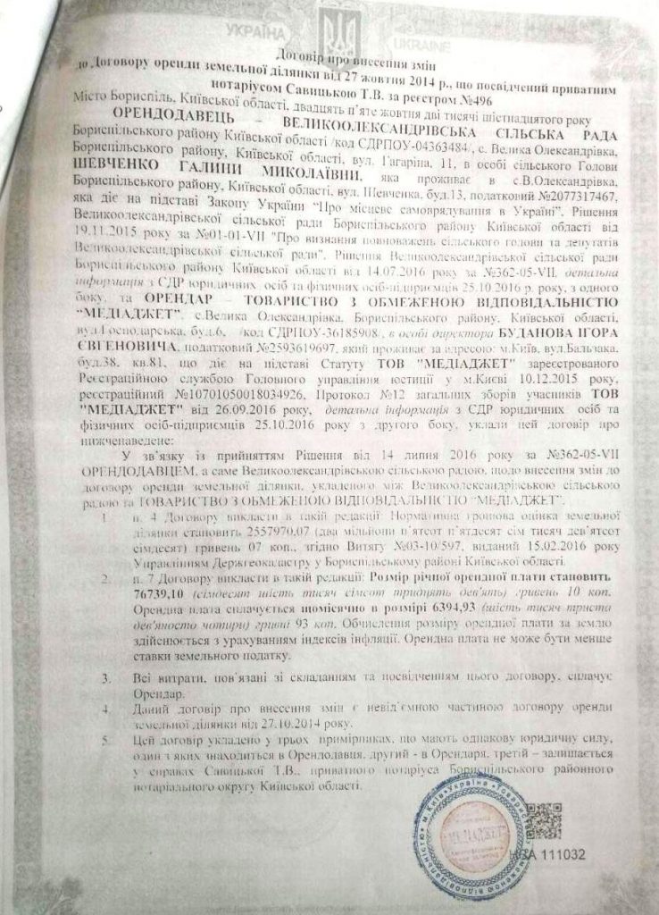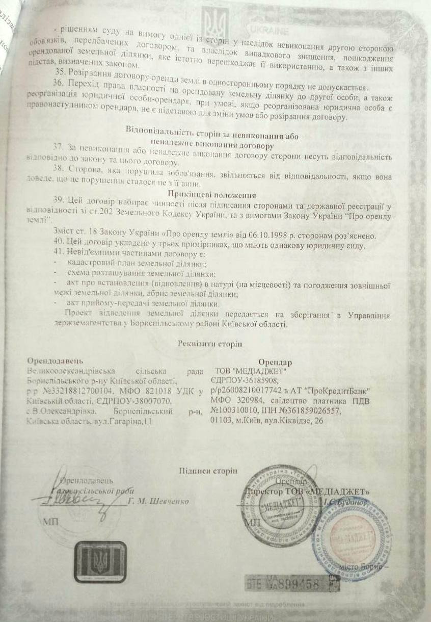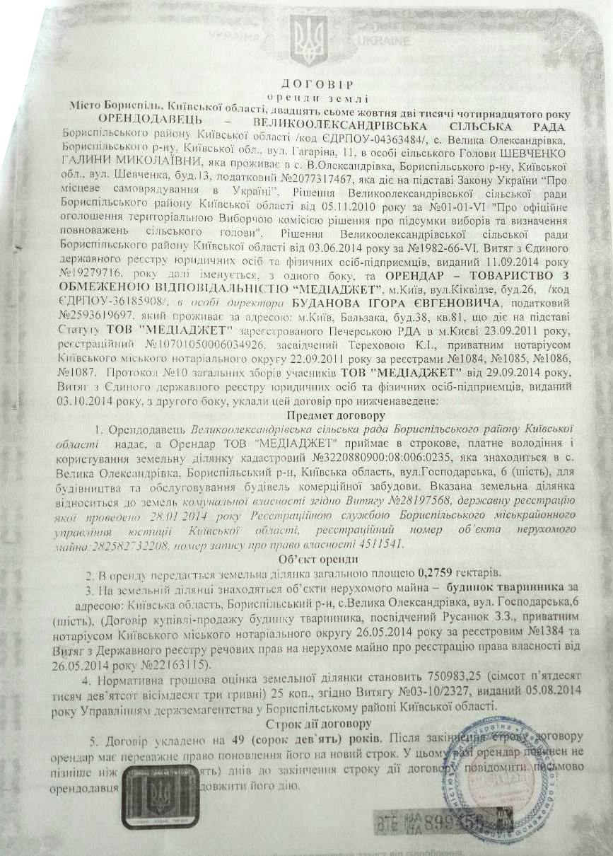 27 жовтня 2014 року Товариство з обмеженою відповідальністю «Медіаджет» укладає договір довгострокової оренди (на 49 років) земельної ділянки з Великоолександрівською сільською радою Бориспільського району Київської області. Площа ділянки – 0,2759 га, призначення – для будівництва та обслуговування будівель комерційної забудови. Кадастровий номер - 3220880900:08:006:0235.